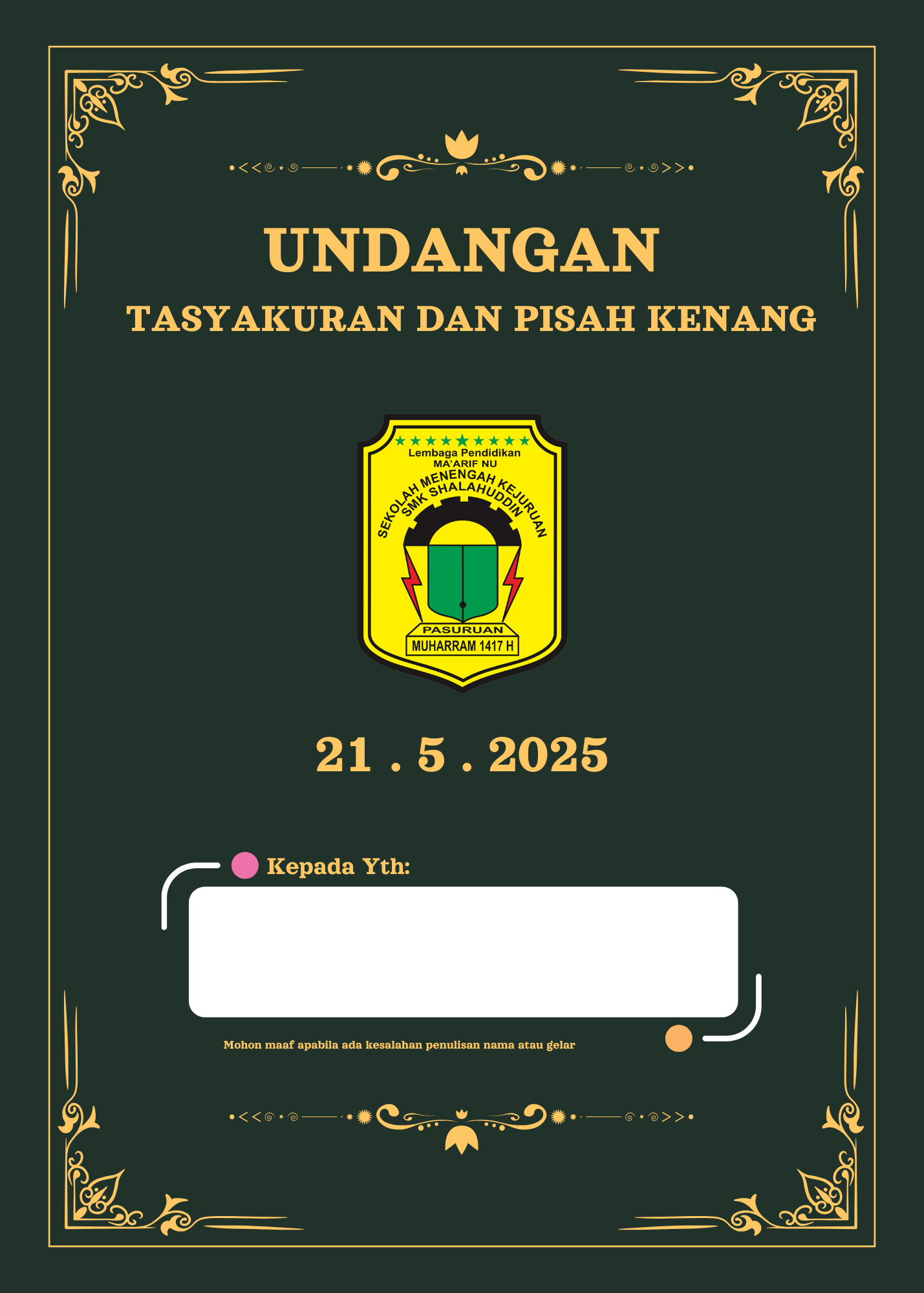 Dengan hormat, Kami mengundang Bapak/Ibu untuk menghadiri acara Tasyakuran dan Pisah Kenang siswa-siswi kelas XII SMK Shalahuddin Pasuruan sebagai bentuk penghormatan atas pencapaian mereka selama menempuh pendidikan di sekolah ini.